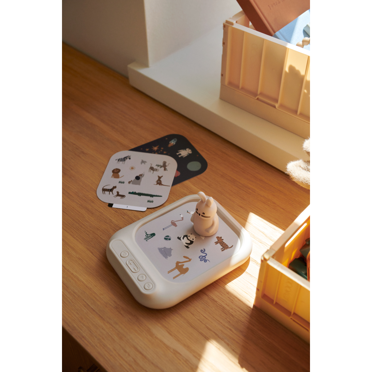 Pentru a declansa sunetele, copilul trebuie doar sa aseze figurina simpatica de iepuras din silicon pe diferite elemente ilustrate. Fiecare tema ofera sunete specifice, de la sunete de animale pana la lansari de rachete, incurajand curiozitatea, invatarea si recunoasterea relatiei cauza-efect.