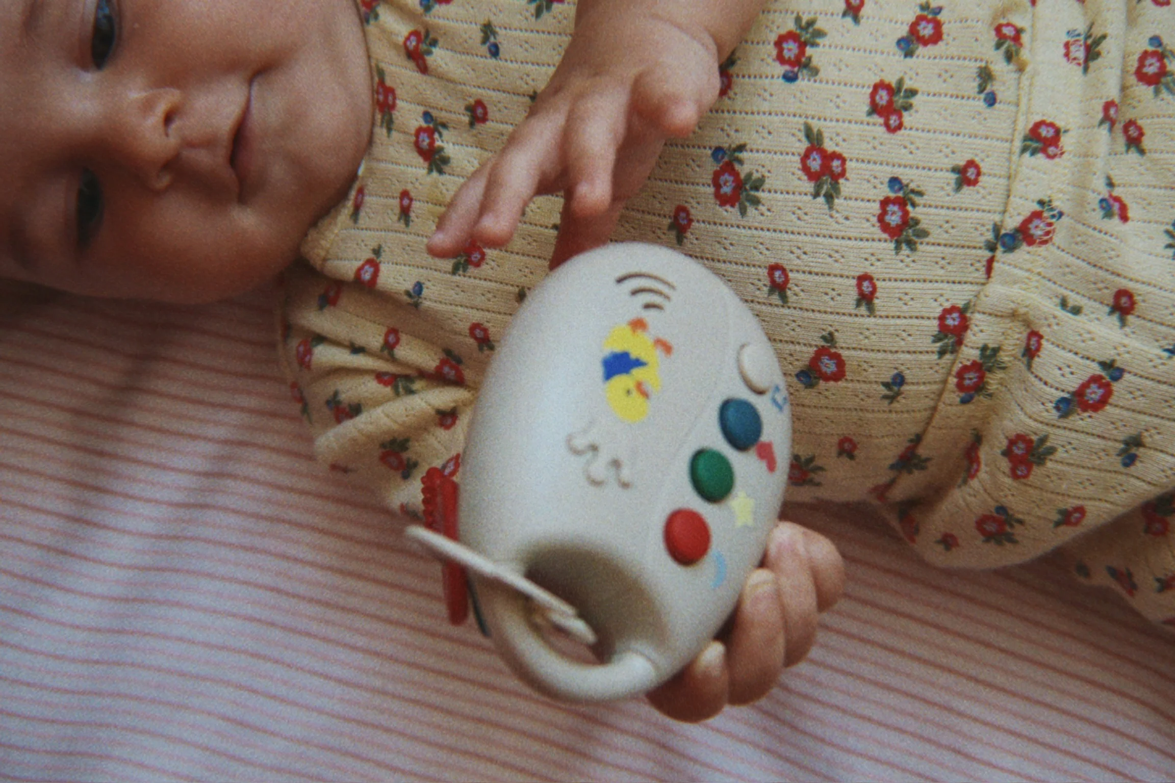 Realizata din materiale sigure, non-toxice, jucaria este ideala si pentru perioada dentitiei, fiind placuta de mestecat si calmanta pentru gingii. Designul colorat si jucaus atrage atentia bebelusului si incurajeaza dezvoltarea coordonarii mana-ochi si a abilitatilor motorii fine.